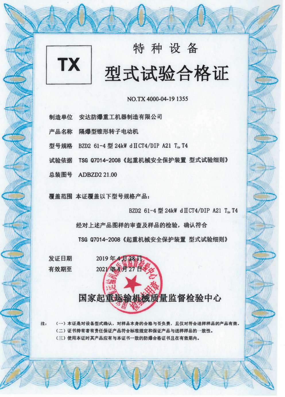 榮譽(yù)資質(zhì) 隔爆型錐形轉(zhuǎn)子電動機(jī) TX型式試驗(yàn)合格證