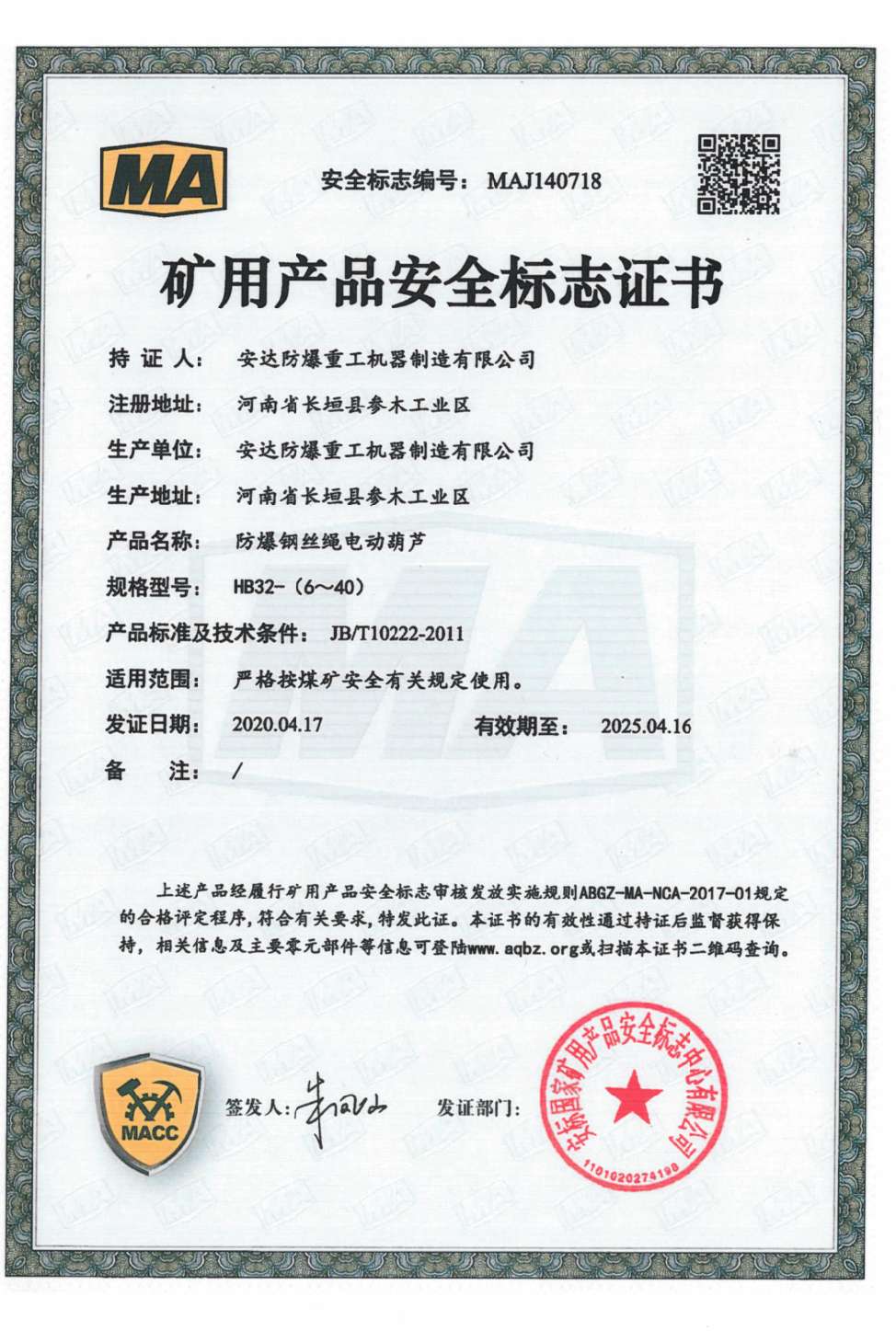 | 發(fā)證機(jī)構(gòu): | 安標(biāo)國(guó)家礦用產(chǎn)品安全標(biāo)志中心有限公司 | 發(fā)證時(shí)間 : | 2020-04-14 |