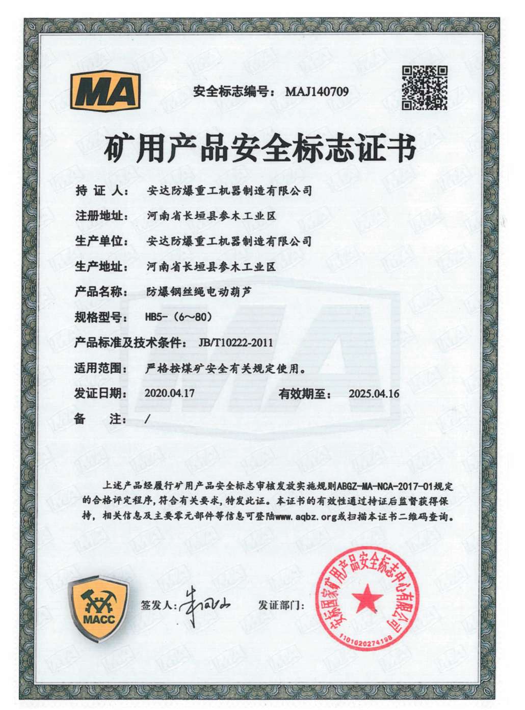 發證機構:   安標國家礦用產品安全標志中心有限公司 發證時間 :   2020-04-17