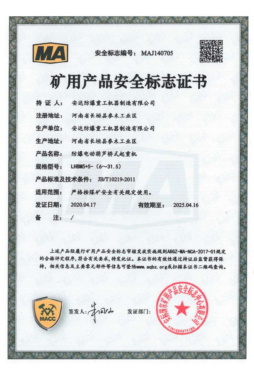 防爆鋼絲繩葫蘆橋式起重機 礦用產品安全標志證書