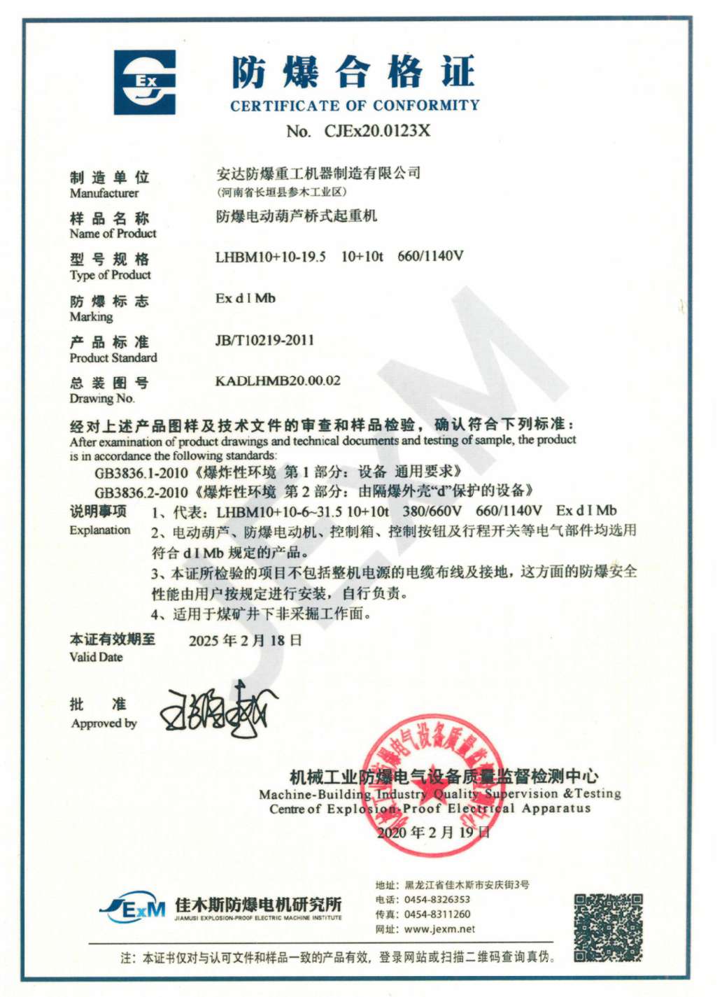 發(fā)證機(jī)構(gòu):   機(jī)械工業(yè)防爆電氣設(shè)備質(zhì)量監(jiān)督檢測(cè)中心 發(fā)證時(shí)間 :   2020-02-19