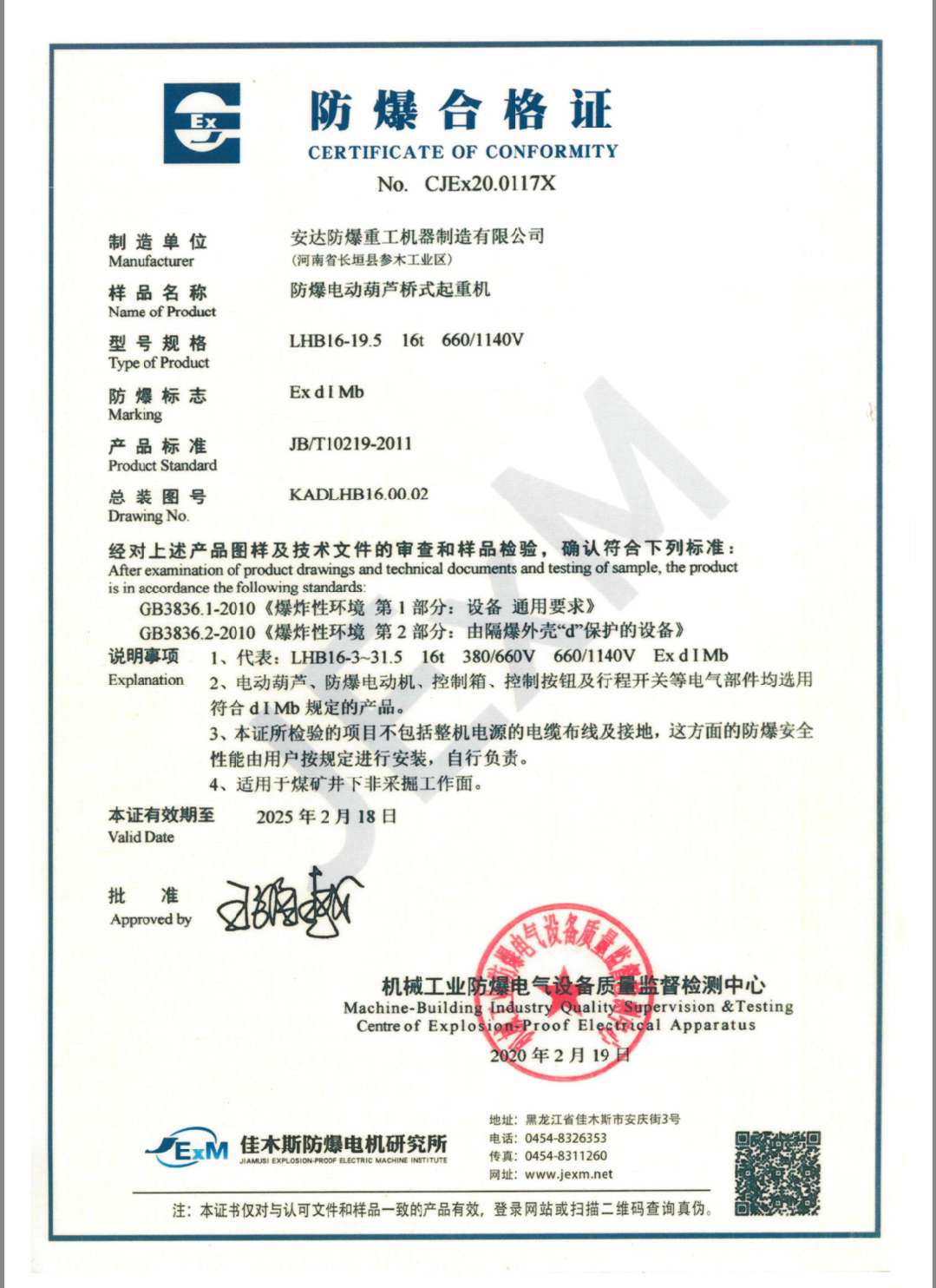 發證機構:   機械工業防爆電氣設備質量監督檢測中心 發證時間 :   2020-02-19