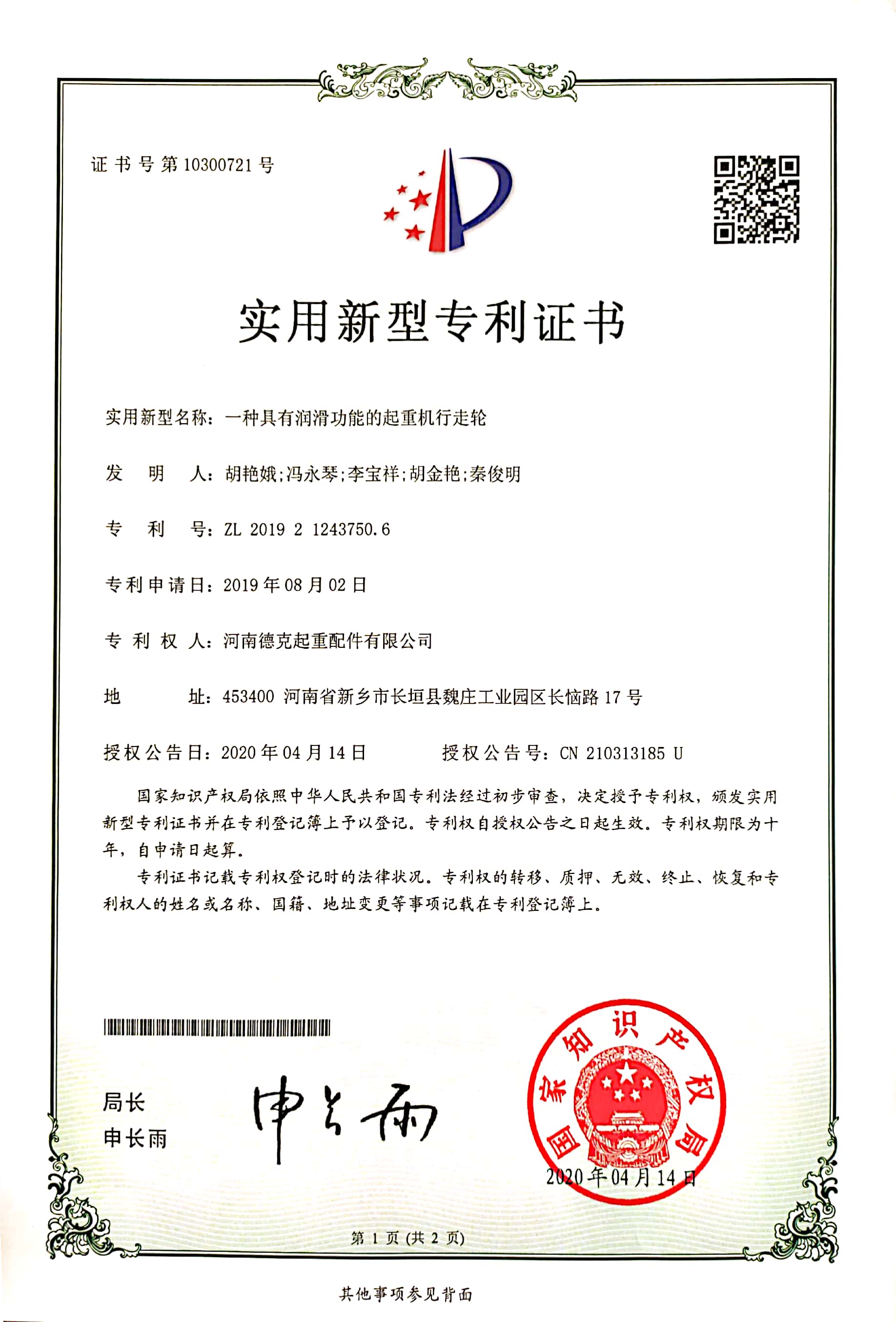 發證機構:   國家知識產權局 發證時間 :   2020-04-28