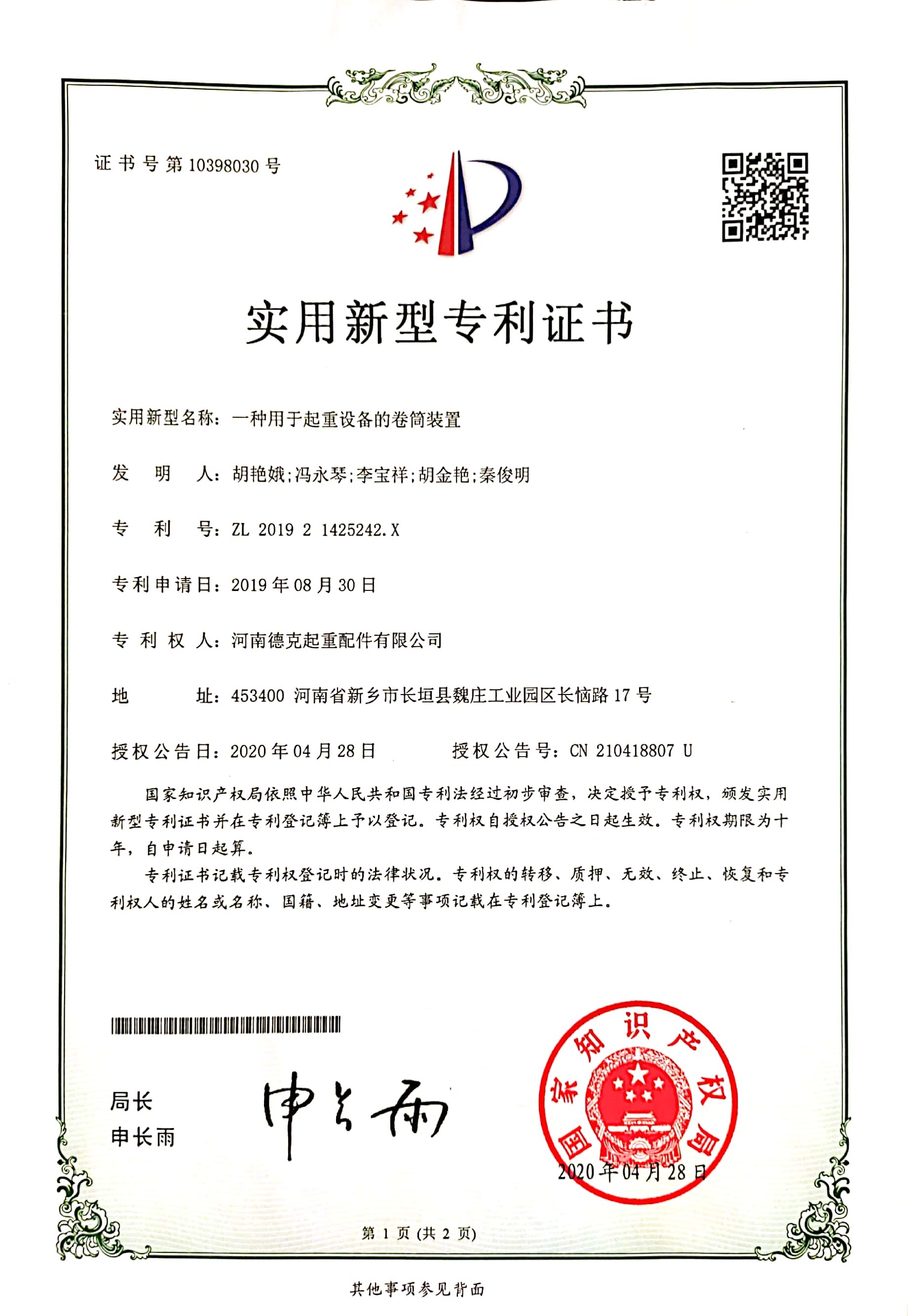 證書介紹 一種用于起重設(shè)備的卷筒裝置