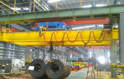 橋式起重機是橫架于車間、倉庫和料場上空進行物料吊運的起重設(shè)備。由于它的兩端坐落在高大的水泥柱或者金屬支架上,形狀似橋。橋式起重機的橋架沿鋪設(shè)在兩側(cè)高架上的軌道縱向運行,可以充分利用橋架下面的空間吊運物料,不受地面設(shè)備的阻礙。它是使用范圍**廣、數(shù)量**多的一種起重機