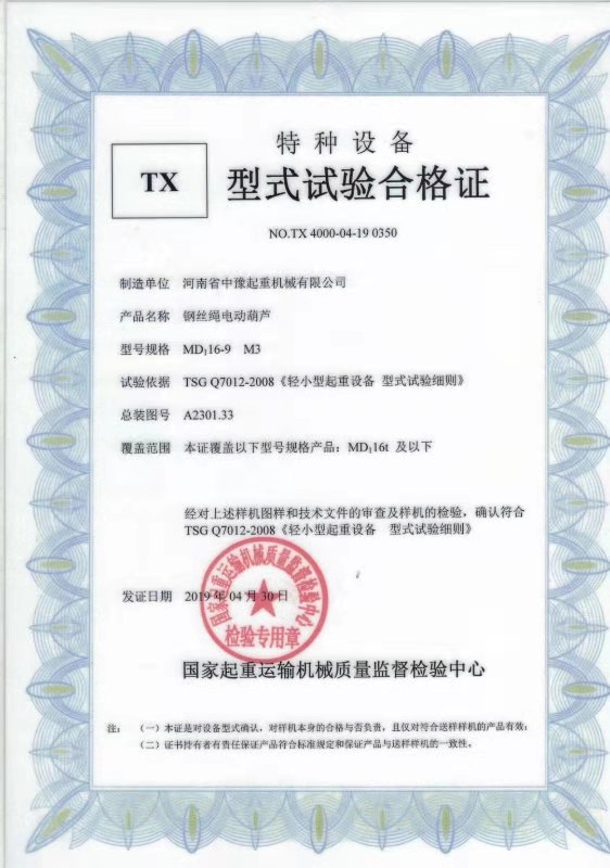 發證機構:   國家起重運輸機械質量監督檢驗中心 發證時間 :   2019-04-30