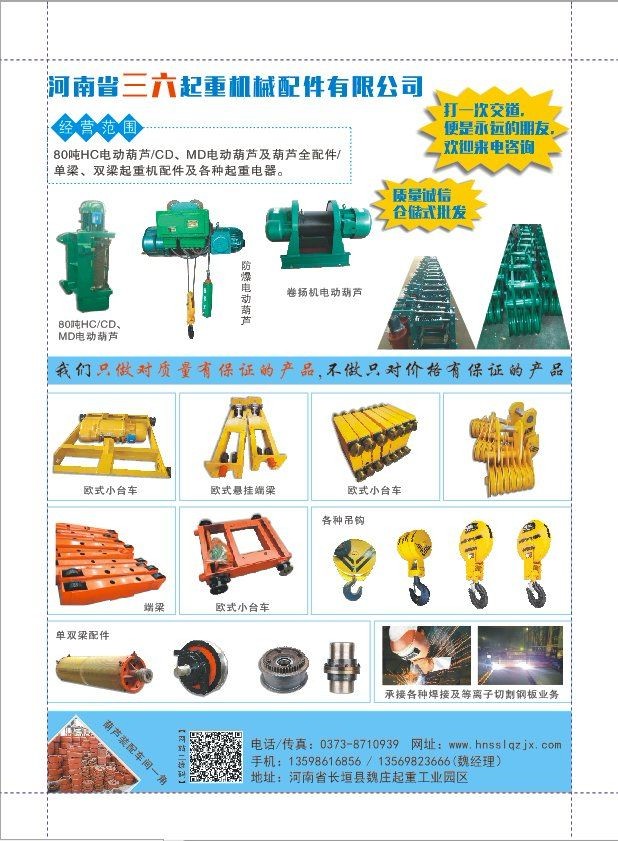 河南省三六起重機(jī)械配件有限公司專(zhuān)業(yè)生產(chǎn)及銷(xiāo)售起重配件,主要銷(xiāo)售:CD1、MD、HC、BCD各種型號(hào)電動(dòng)葫蘆、葫蘆配件、電機(jī)、葫蘆減速機(jī)、葫蘆全配件、起重機(jī)LD300輪、LD400輪、雙梁起重機(jī)輪組、卷筒組、吊鉤組、聯(lián)軸器、電纜卷筒、起重機(jī)安全滑線、聚氨酯緩沖器、彈簧緩沖器、液壓緩沖器、制動(dòng)器、旋臂吊、液壓平臺(tái)等起重機(jī)配件。