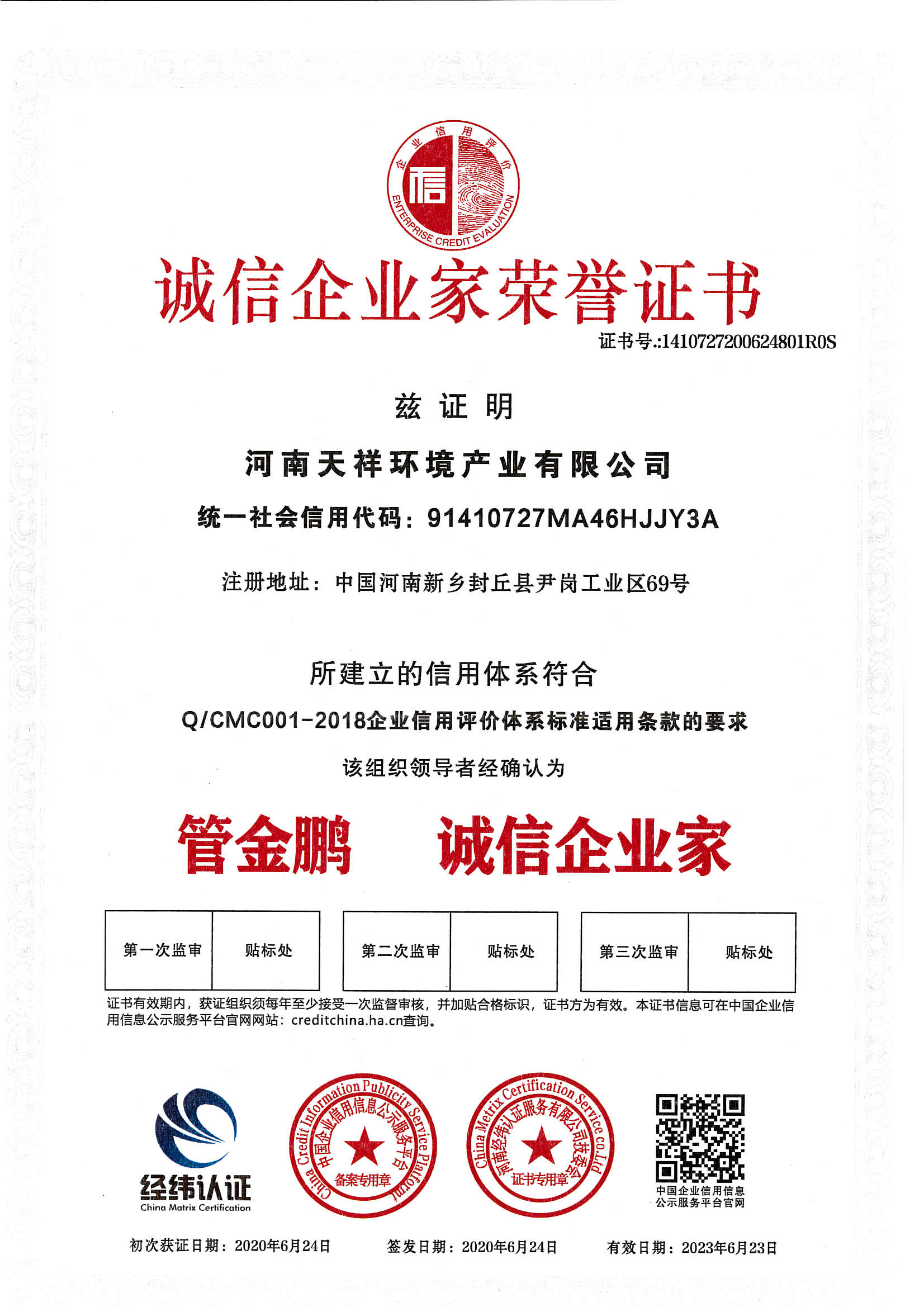 誠信企業家榮譽證書