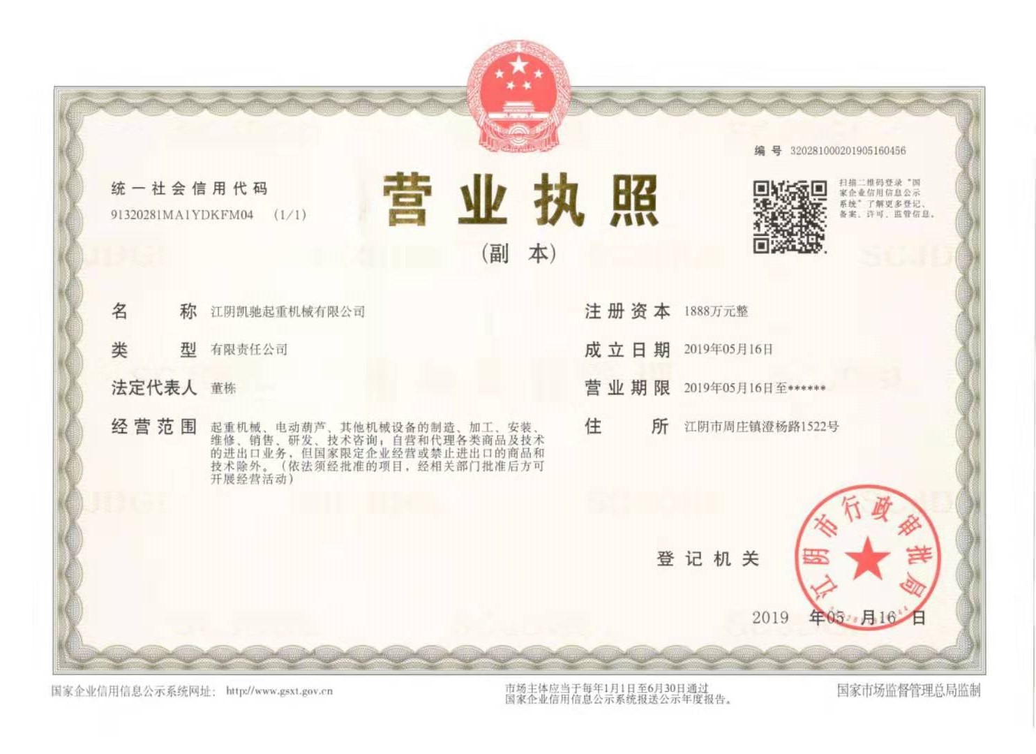 » 江陰凱馳起重機械有限公司營業執照