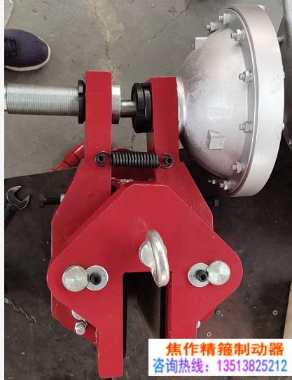 1、氣缸, 2、右制動臂 3、復位彈簧 5、活塞桿 6、調整桿 7、螺母 8、左制動臂 9、基座 10、制動塊11、彈簧鋼絲 12、摩擦片