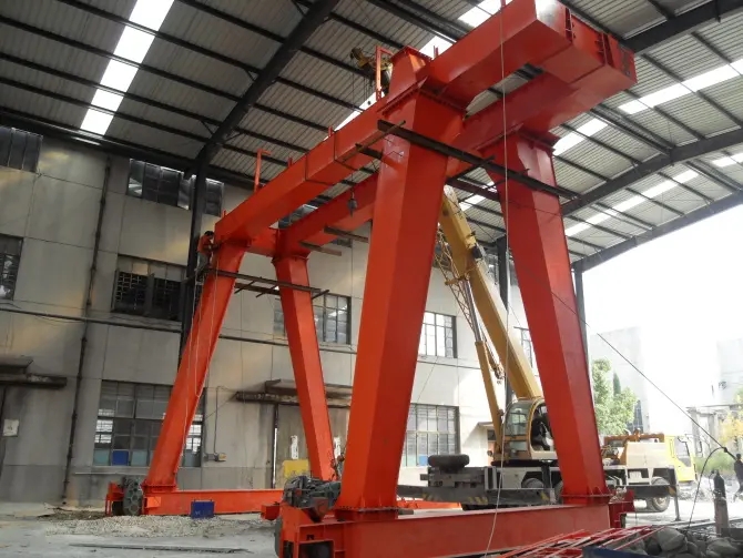 它的金屬結構像門形框架,承載主梁下安裝兩條支腳,可以直接在地面的軌道上行走,主梁兩端可以具有外伸懸臂梁。
