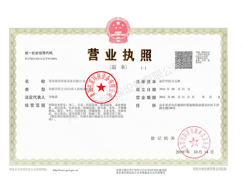 證書介紹 兆星環(huán)保營(yíng)業(yè)執(zhí)照