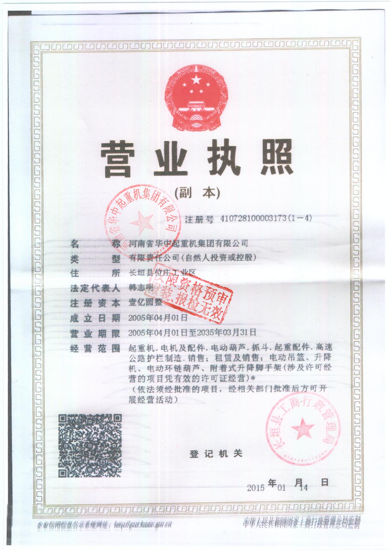 發證機構:   長垣縣工商行政管理局 發證時間 :   2015-01-14