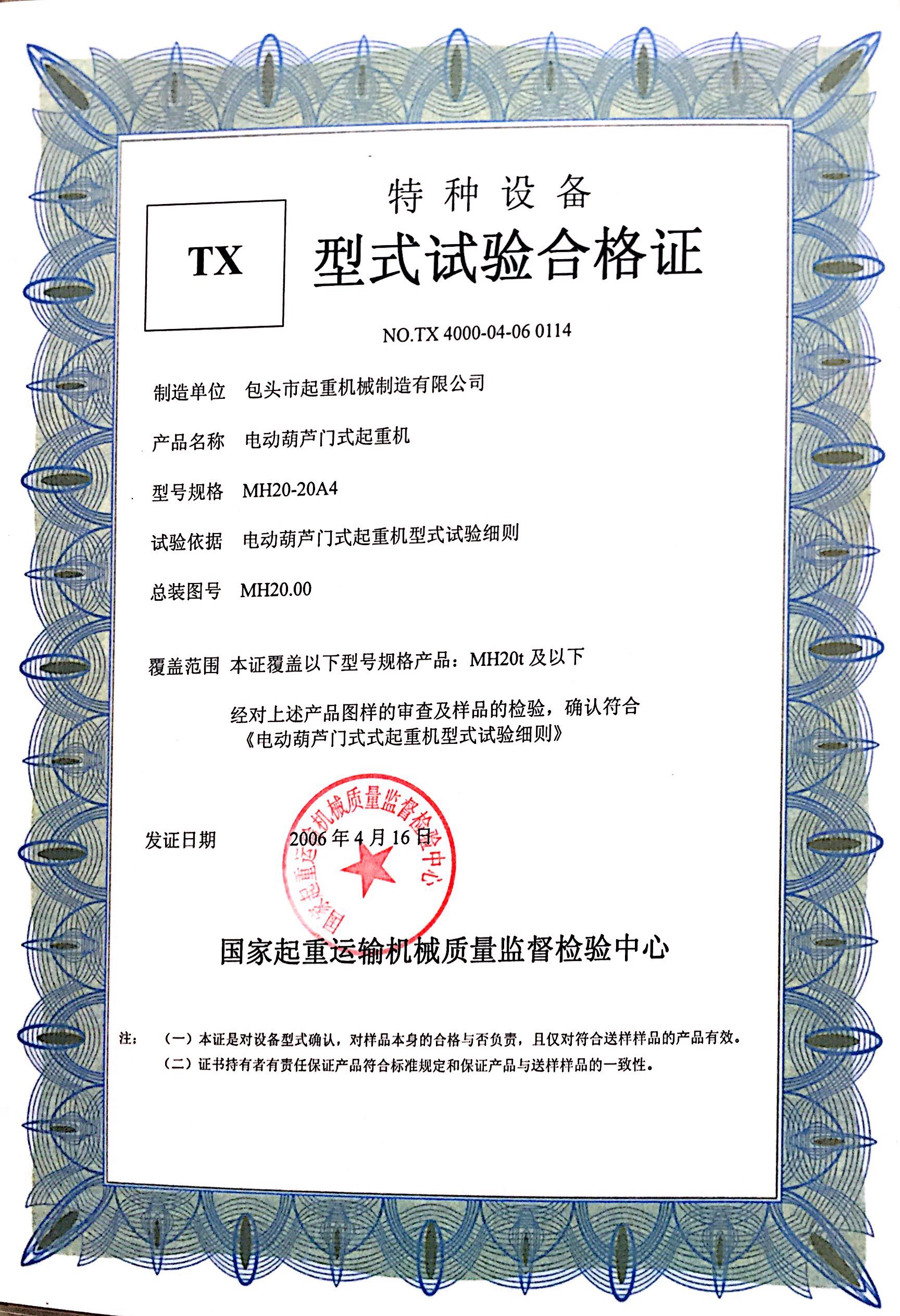 | 發(fā)證機(jī)構(gòu): | 國家起重運(yùn)輸機(jī)械質(zhì)量監(jiān)督檢驗(yàn)中心 | 發(fā)證時間 : | 2006-04-16 |