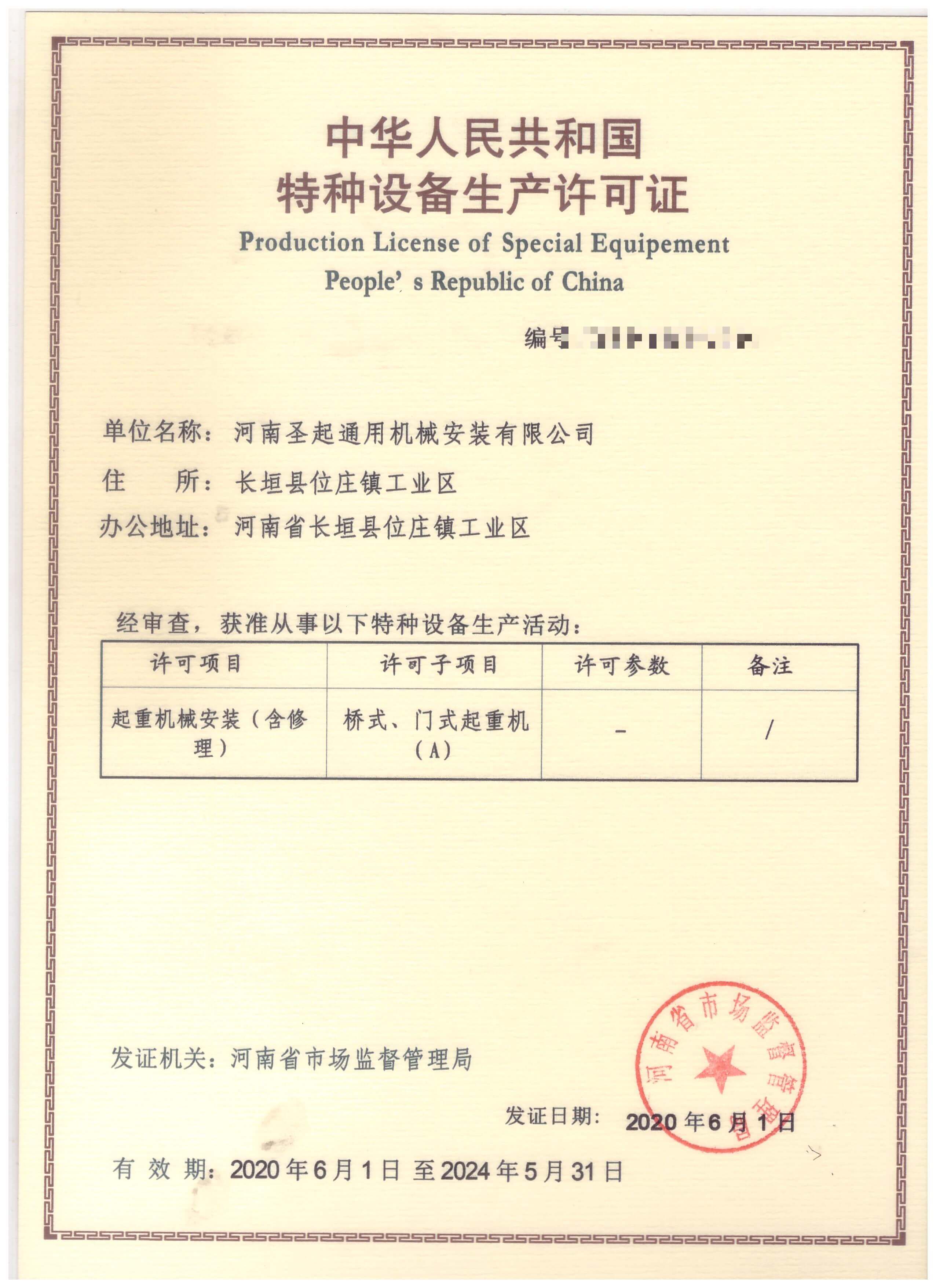 中華人民共和國特種設備生產許可證