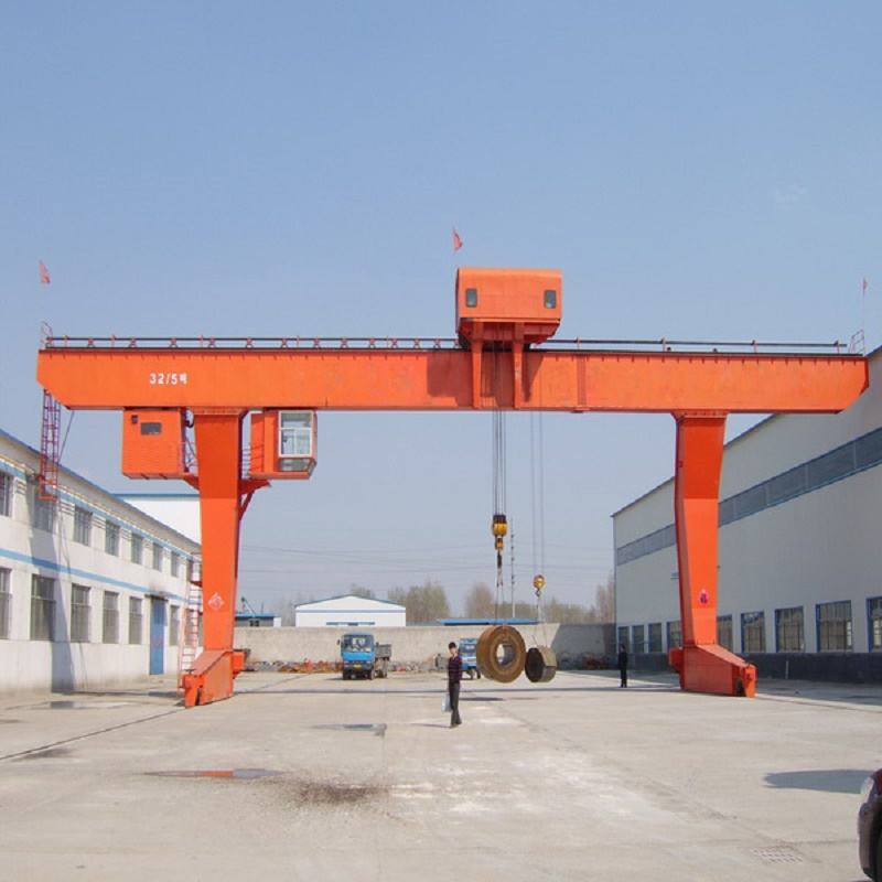 它的金屬結(jié)構(gòu)像門形框架,承載主梁下安裝兩條支腳,可以直接在地面的軌道上行走,主梁兩端可以具有外伸懸臂梁。