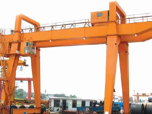 “門式起重機是橋式起重機的一種變形,又叫龍門吊。主要用于室外的貨場、料場貨、散貨的裝卸作業(yè)。門式起重機具有場地利用率高、作業(yè)范圍大、適應面廣、通用性強等特點,在港口貨場得到廣泛使用。它的金屬結構像門形框架,承載主梁下安裝兩條支腳,可以直接在地面的軌道上行走,主梁兩端可以具有外伸懸臂梁。”