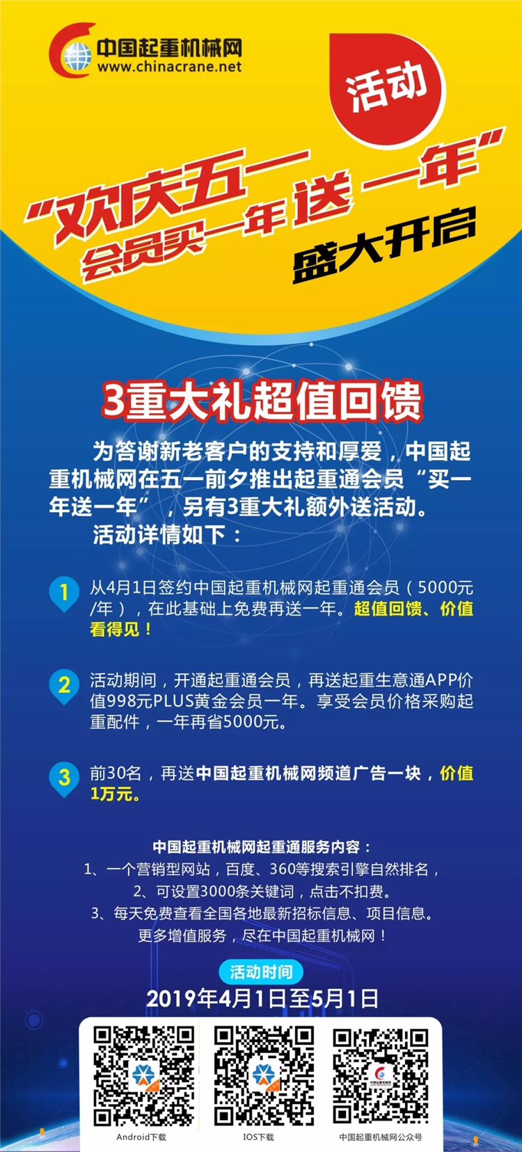 中國起重機械網開啟慶五一“會員買一年送一年”活動,三重大禮超值回饋,鉅惠活動不容錯過。