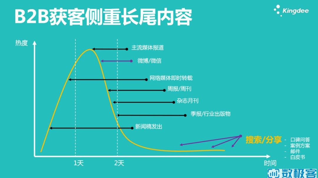 實際上,能幫助我們獲客的是在傳播周期的最末尾。我稱這個為B2B的長尾內容,此時客戶在網上搜索這個信息時,轉化率會比前期高很多。