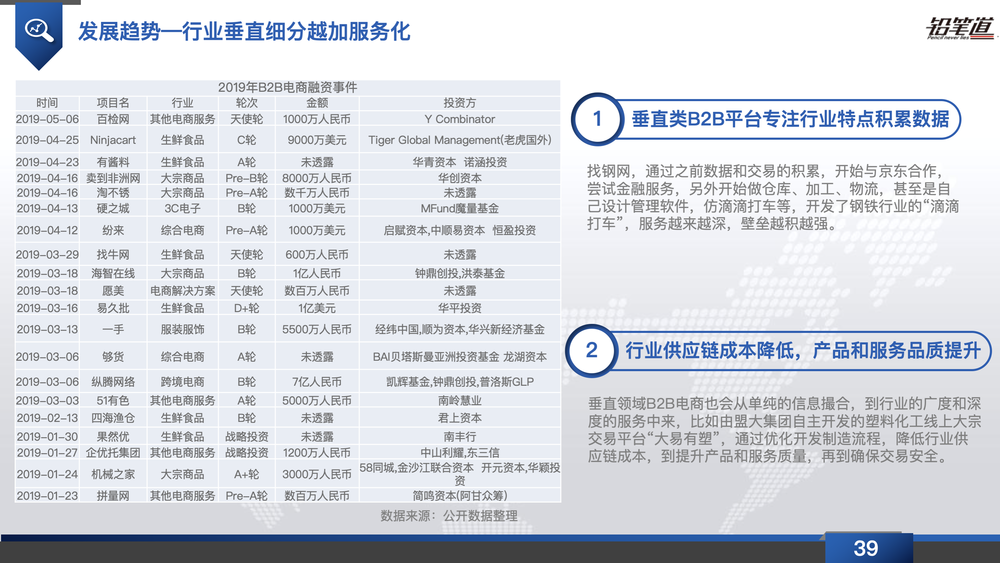 B2B電商行業自2015年迎來熱潮之后,資本逐步向頭部平臺聚攏,大平臺基于歷史數據的積累快速發展更全面的供應鏈服務提升行業壁壘。但隨著產業鏈的變革,行業必然會出現新的機會,垂直B2B電商憑借縱深的行業積累以及專業化的增值服務將發揮其充分的價值。