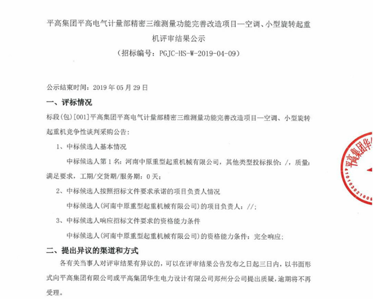 平高集團平高電氣計量部精密三維測量功能完善改造項目—空調、小型旋轉起重機評審結果公示