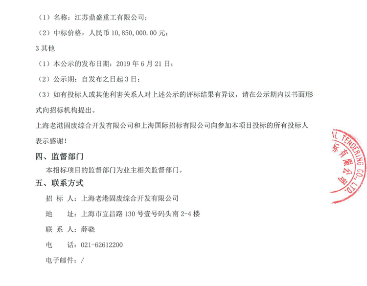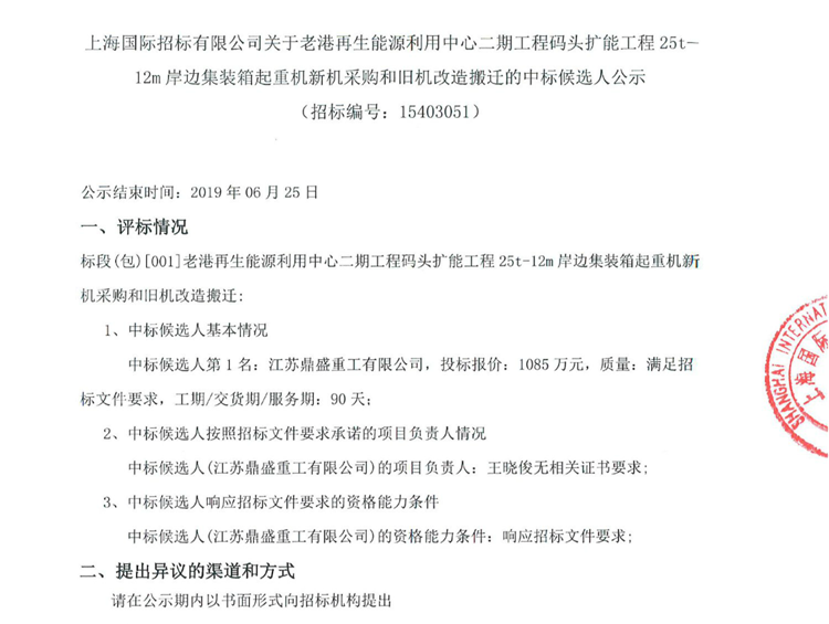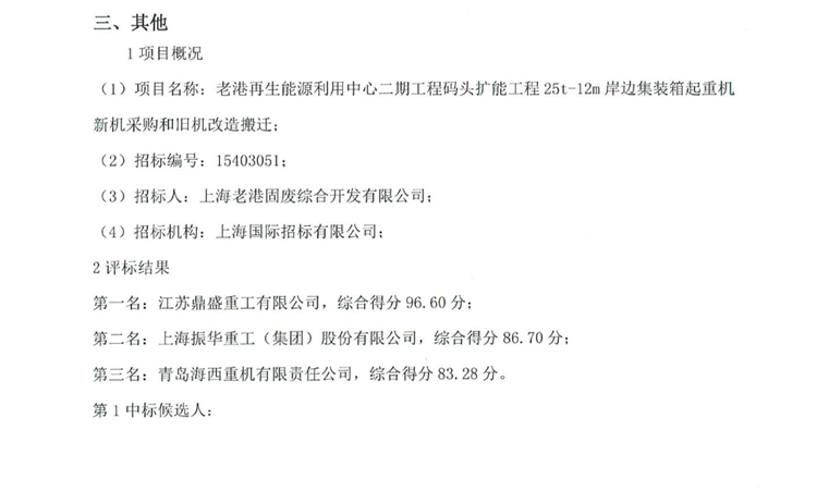 移動版:關于老港再生能源利用中心二期工程碼頭擴能工程25t-12m岸邊集裝箱起重機新機采購和舊機改造搬遷的中標候選人公示