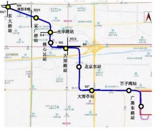線路起點(diǎn)為東大橋站,沿途設(shè)京廣橋站、光華路站、核心區(qū)站、大望路站、北京東站、大郊亭站、廣渠路站,終點(diǎn)至廣渠東路站。