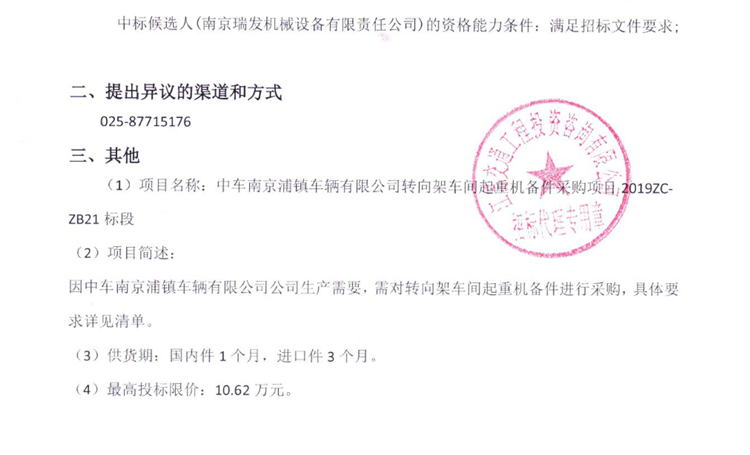 中車南京浦鎮(zhèn)車輛有限公司轉向架車間起重機備件采購項目2019ZC-ZB21標段中標候選人公示