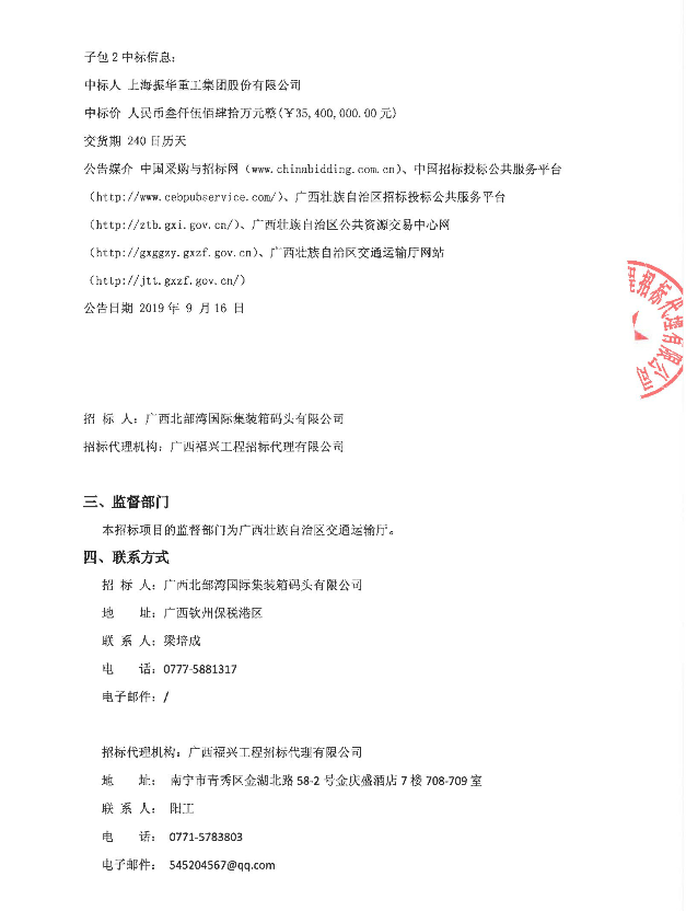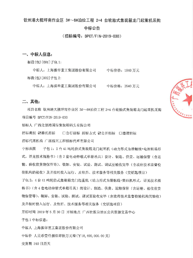 欽州港大欖坪南作業(yè)區(qū) 3#~6#泊位工程 2+4 臺輪胎式集裝箱龍門起重機采購中標(biāo)公告