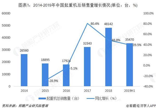 據中國工程機械工業協會統計數據顯示,2019年上半年的起重機合計銷售35470臺,同比增長了39.5%。其中,汽車起重機累計銷售25494臺,同比增加8869臺,增長53.3%。履帶起重機累計銷售1311臺,同比增加345臺,增長35.7%。
