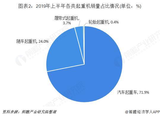 從細分類型來看,2019上半年中國移動式起重機銷量中,汽車起重車占比最大,達到71.9%;其次是隨車起重機,占比達到24.0%;排在第三的是履帶式起重機,占比達到3.7%。輪胎起重機占比較小,僅為0.4%。