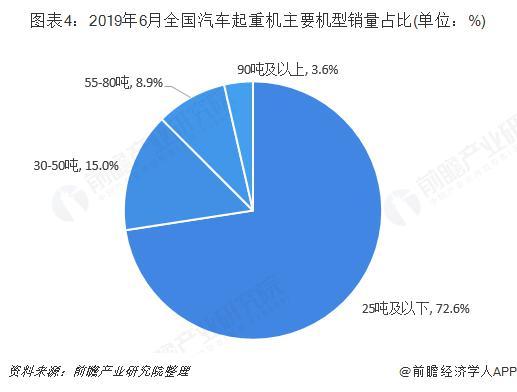 按主要機型銷量來看,2019年6月,25噸及以下汽車起重機銷量最大,達到2212臺,占比為72.6%,其中20噸及25噸占比分別為20.1%和41.7%;其次是30-50噸汽車起重機,銷量達到456臺,占比為15.0%。