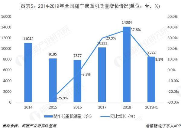 2017年以來,由于環保、更新需求及大型工程建成的需求,起重機械新機銷量一路高升。根據中國工程機械工業協會的統計數據,隨車起重機方面,2018年共計銷售14084臺,同比增長37.6%。2019年上半年,中國隨車起重機累計銷量達到8522臺,同比增長9.9%。