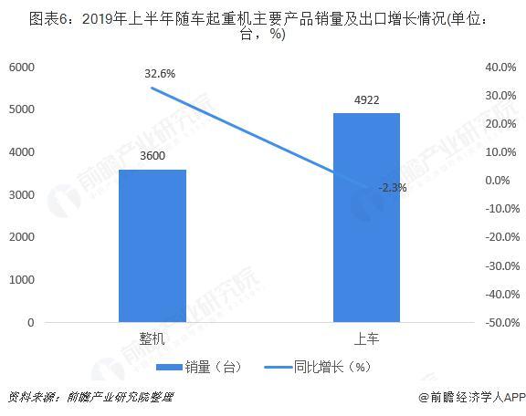 2019年上半年,我國隨車起重機銷量增速大幅下降至10%以下,主要是受上車產品銷售下降的影響。2019年上半年,隨車起重機整機3600臺,同比增加885臺,長32.6%;上車4922臺,同比少116臺,下降2.3%。