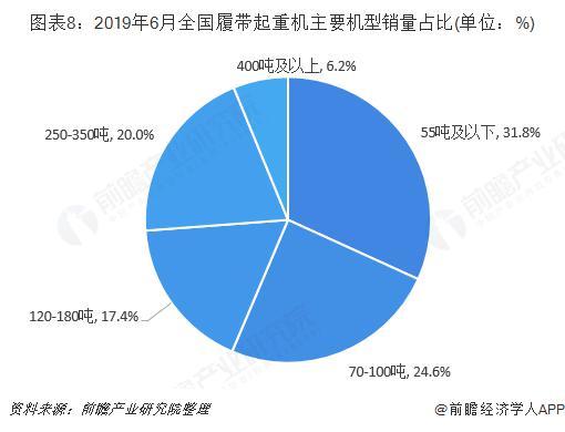 按主要機型銷量來看,2019年6月,55噸及以下履帶起重機銷量最大,達到62臺,占比為31.8%,其中55噸產品銷售40臺,占比為20.5%;其次是70-100噸履帶起重機產品,銷量達到48臺,占比為24.6%。