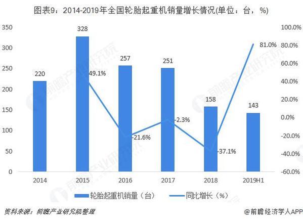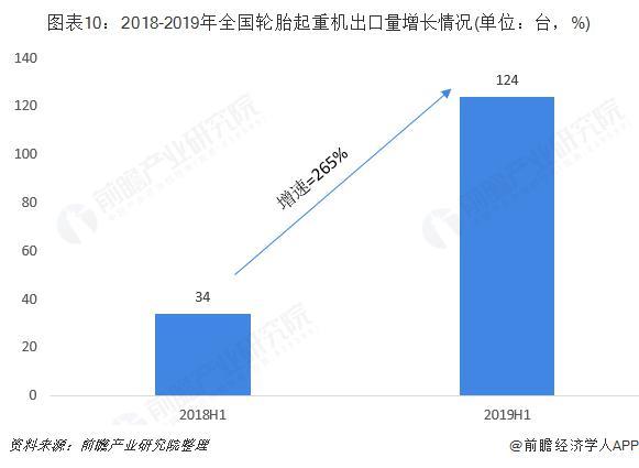 目前,輪胎起重機是我國起重機設備中最小的一類,銷售占比還不足1%。近年來,隨著徐工自主研發輪胎起重機的成功,其輪胎起重機普及度就不斷提升,2019年1-6月,累計售143臺,同比增加64臺,增長81%,市場需求主要靠出口市場拉動。