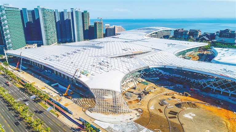 6月12日,航拍正在加緊建設中的海南國際會展中心二期項目。目前,海南國際會展中心二期項目外立面幕墻裝飾以及內部裝修均已進入收尾階段,預計6月底全面完工。