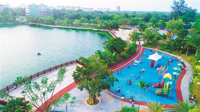 7月9日,文昌市文城鎮霞洞湖公園,不少市民在公園漫步,享受美好時光。