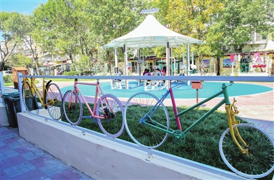 我市河?xùn)|區(qū)充分結(jié)合小區(qū)特色和居民需求,利用社區(qū)空地著力打造一批“口袋公園”。日前,位于河?xùn)|區(qū)向陽(yáng)樓街道晨光樓社區(qū)26號(hào)樓旁的聚心園建成并開(kāi)放,廢舊自行車做成的彩色圍墻、藍(lán)色的塑膠跑道、嶄新的健身驛站,亮麗的景觀讓人眼前一亮,讓居民可“推窗見(jiàn)綠、出門進(jìn)園”,成為家門口休閑、運(yùn)動(dòng)、娛樂(lè)的好去處。(來(lái)源: 天津日?qǐng)?bào) 吳迪)