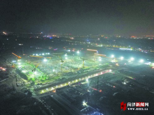 當日20時許,位于菏澤開發區桶子河村的菏澤(高鐵)東站站房施工現場燈火通明。由正對站房入口處的觀望臺向下看,可見站房主體結構、地鐵預留段正照常施工,運輸車、挖掘機、混凝土泵車、塔吊等在各區域照常作業。