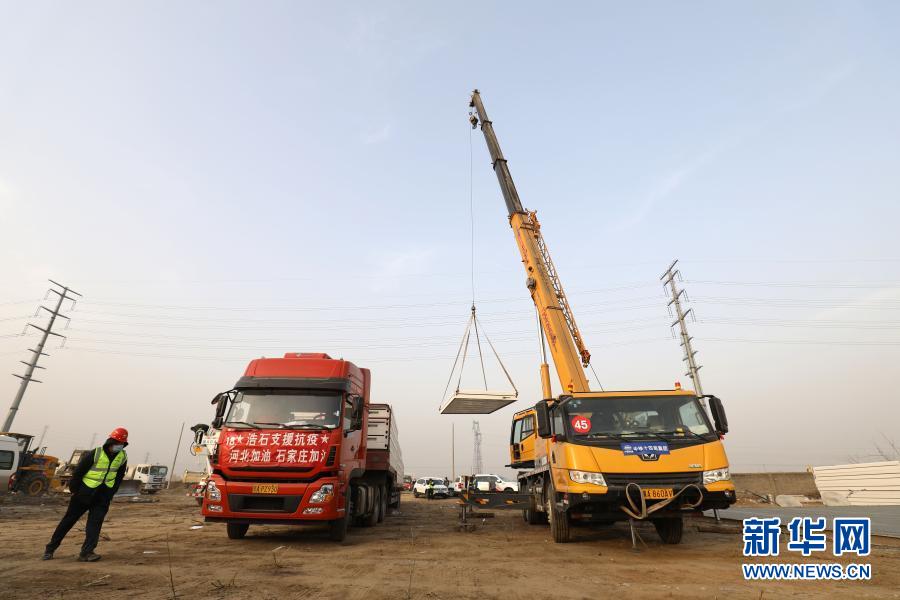 1月14日,工人在石家莊市集中隔離點(diǎn)建設(shè)工地操作設(shè)備將板房材料卸下車。新華社記者 楊世堯 攝