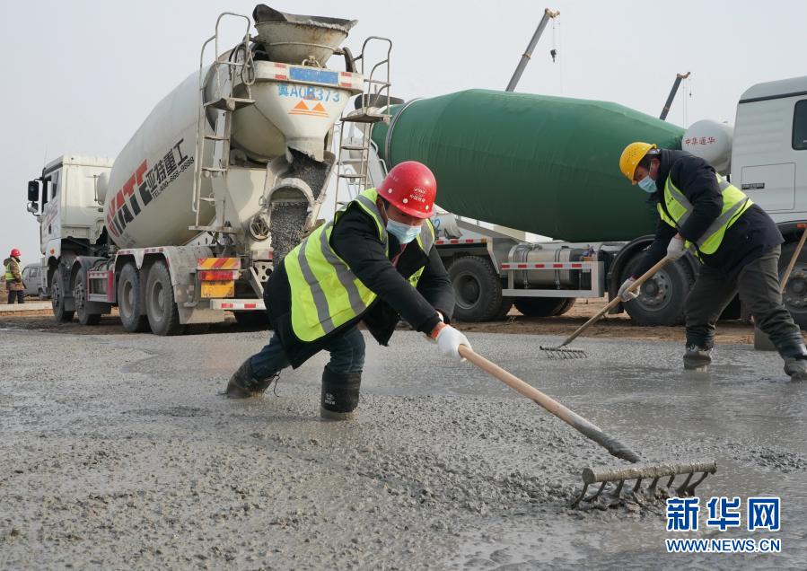 1月14日,工人在石家莊市集中隔離點(diǎn)建設(shè)工地硬化地面。新華社記者 楊世堯 攝