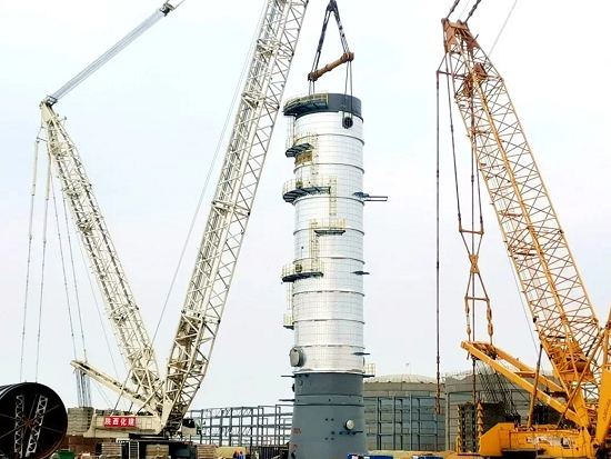 此次吊裝采用1250噸履帶吊為主吊,450噸履帶吊溜尾,歷經2小時設備順利就位。按項目規劃,今年5月底前將完成核心塔器的安裝工作。