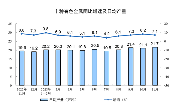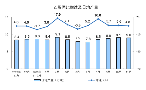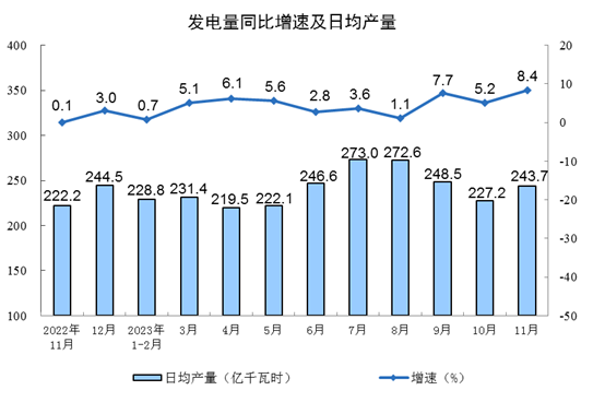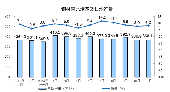 分產品看,11月份,620種產品中有367種產品產量同比增長。其中,鋼材11044萬噸,同比增長4.2%;水泥18979萬噸,增長1.6%;十種有色金屬650萬噸,增長7.1%;乙烯269萬噸,增長4.8%;汽車295.3萬輛,增長23.6%,其中新能源汽車100.6萬輛,增長35.6%;發電量7310億千瓦時,增長8.4%;原油加工量5953萬噸,增長0.2%。