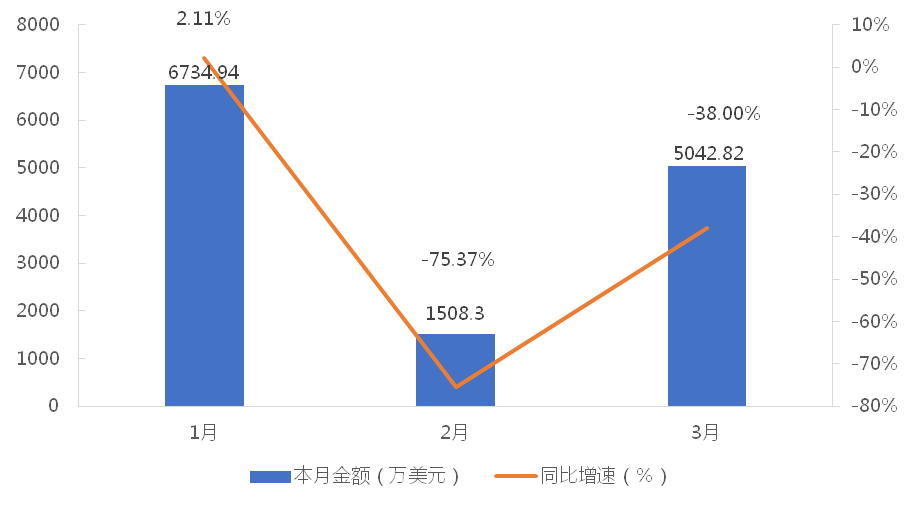 1-3月,我國(guó)龍門式起重機(jī)累計(jì)出口金額為13286.06萬美元,同比下降36.29%;累計(jì)出口數(shù)量為974臺(tái),同比增長(zhǎng)12.60%;出口均價(jià)為13.64萬美元/臺(tái),同比下降43.43%。