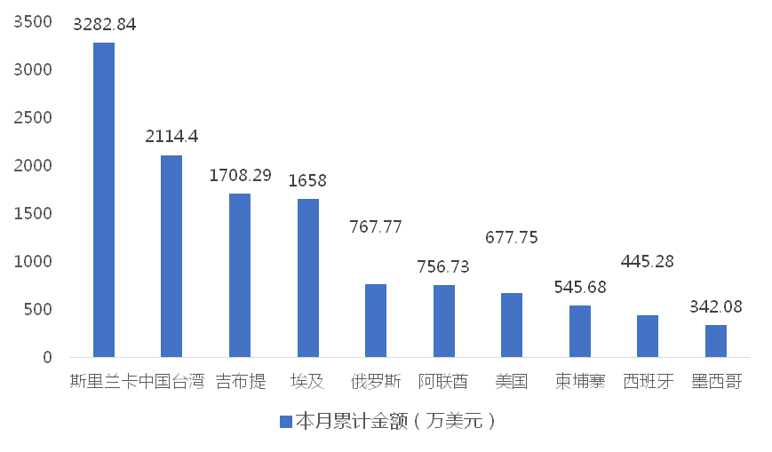 1-3月,我國(guó)龍門式起重機(jī)出口金額排名前十的國(guó)家/地區(qū)分別為斯里蘭卡、中國(guó)臺(tái)灣、吉布提、埃及、俄羅斯、阿聯(lián)酋、美國(guó)、柬埔寨、西班牙、墨西哥,合計(jì)占我國(guó)該產(chǎn)品出口總額的92.57%。其中,向斯里蘭卡出口最多,金額為3282.84萬美元,占出口總額的24.71%。