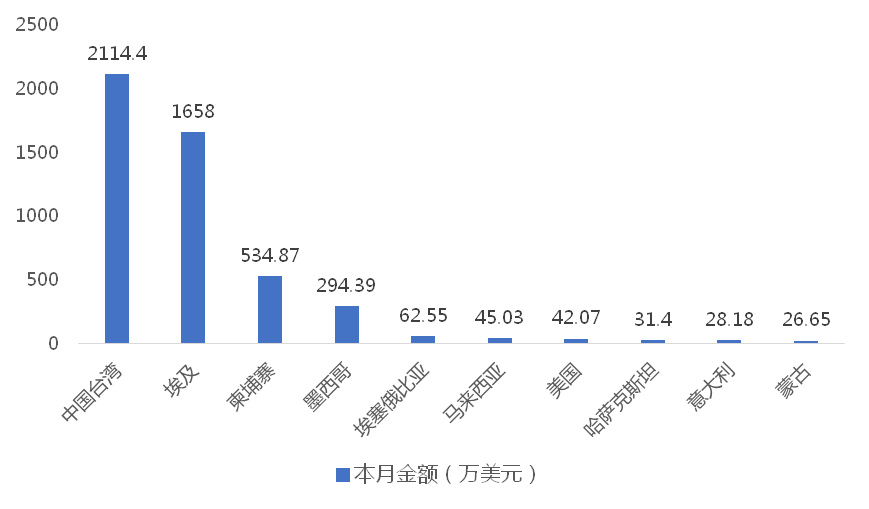 2025年3月,我國(guó)龍門式起重機(jī)出口金額排名前十位的國(guó)家/地區(qū)分別為中國(guó)臺(tái)灣、埃及、柬埔寨、墨西哥、埃塞俄比亞、馬來西亞、美國(guó)、哈薩克斯坦、意大利、蒙古,合計(jì)占我國(guó)該產(chǎn)品出口總額的95.93%。其中,向中國(guó)臺(tái)灣出口最多,金額為2114.40萬美元,占出口總額的41.93%。